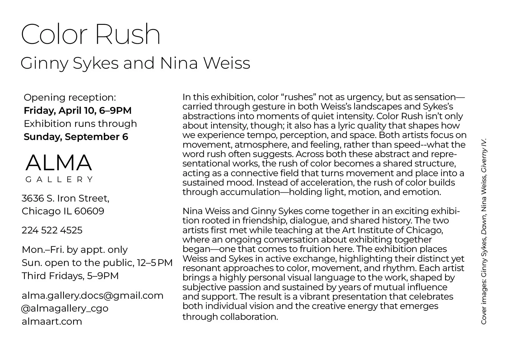 Color Rush Friday, April 10, 2026 6:00 PM 9:00 PM ALMA Gallery 3636 South Iron Street Chicago, IL, 60609 United States (map) Google Calendar ICS